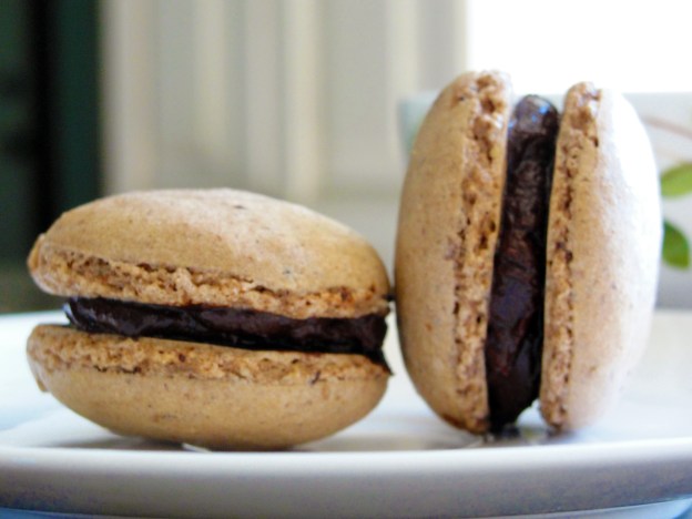 I made the basic macaron recipe and added a couple spoonfuls of cocoa powder to the almond flour. I didn’t add any food coloring to the shells because I figured the cocoa would give it a decent tint—and I was out of brown food coloring. I made the ganache by melting chocolate with some espresso and heavy cream on a double boiler.
