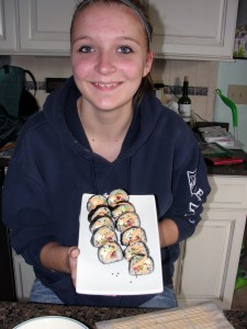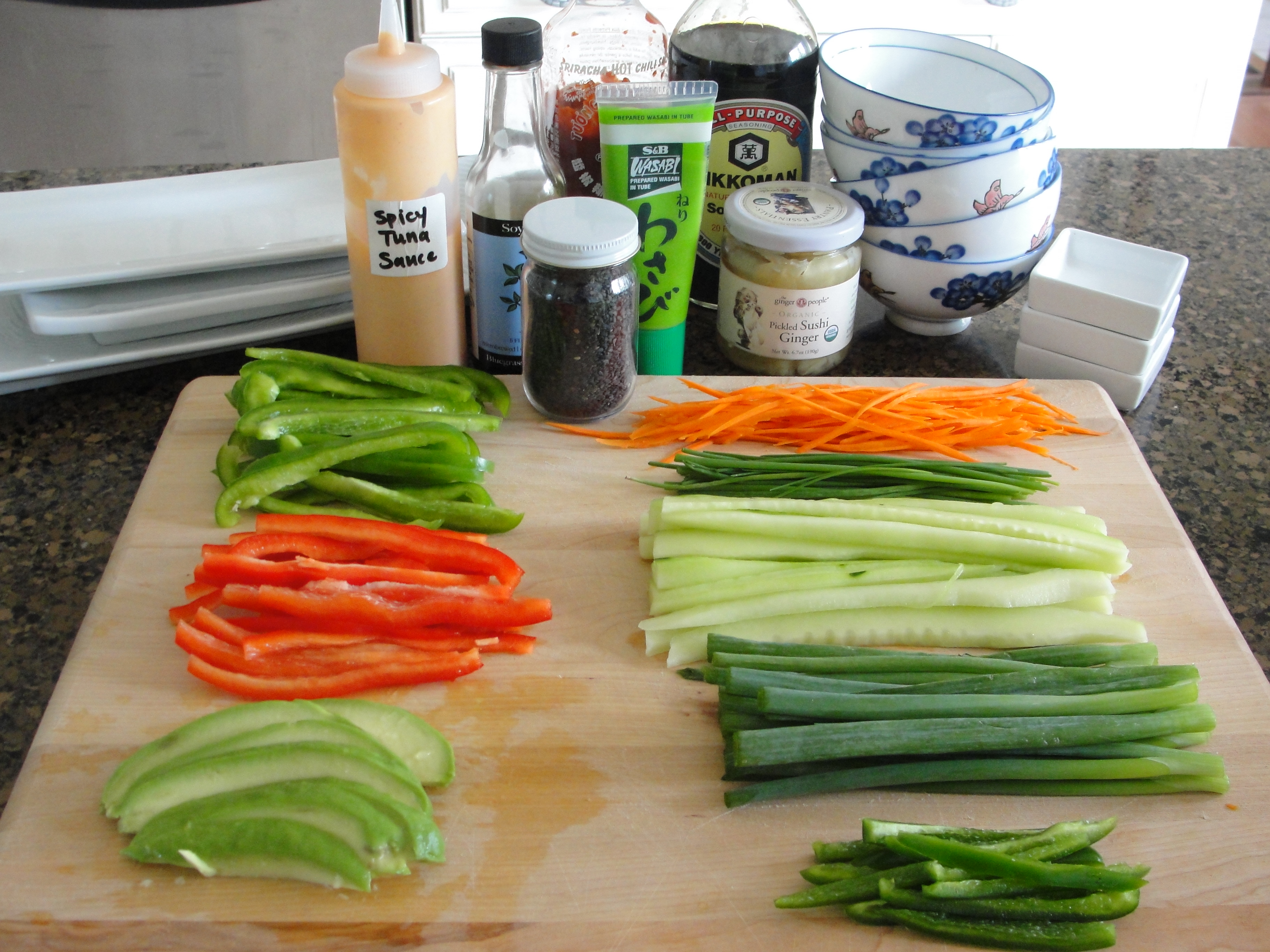 As for the fish, I like tuna. We’ve used salmon before too, and it was good. Make sure that when you purchase the fish it is sold as “sushi grade”. I usually get it from our grocery store and we’ve never had any issues. Just slice it up right before your guests arrive and put it back in the fridge until you need it. We also usually grab some of those imitation crab meat stick things. I find most people like them…and Isabelle LOVES them! I try and have a pretty varied veggie spread too, but sometimes what I want in my sushi just can’t be found. Like sprouts! Where in the world can a person buy sprouts in Rochester?! We went to 3 different stores, including the Asian market, and left empty handed. I slice everything and lay it on a cutting board so its easy for everyone to pick what they want.