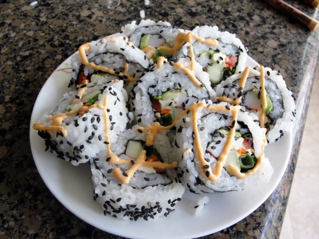 It helps if you cover your mat with plastic wrap before you start…I use press-and-seal. I also set a couple bowls of water out too. It comes in handy when your fingers are so full of sticky rice that they seem like they are practically glued together. This will happen. I promise.