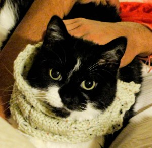 Also…How cute is this?!  It’s my cat wearing a mini scarf!  I’m starting to get the hang of this knitting thing…