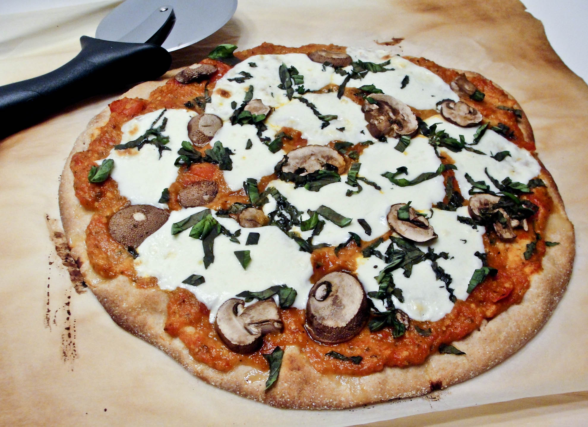 After I had both the crust and the sauce figured out…I had to decide what to top it with.  I wasn’t really in a meat eating mood and I wanted to stick with something simple and flavorful.  We had lots of mushrooms in the fridge, and basil too.  I knew Piyush loves Mozzarella…and since I was trying to convince him that pizza is a food he should love…that decision was easy.  Mozzarella, it was! We bought a 8oz ball, and I used about half of it.  I thinly sliced the ball and then flattened those slices even more with my hands.  I dried them off with a paper towel (they were a little wet), cut them into halves, and slapped them on the the zah.