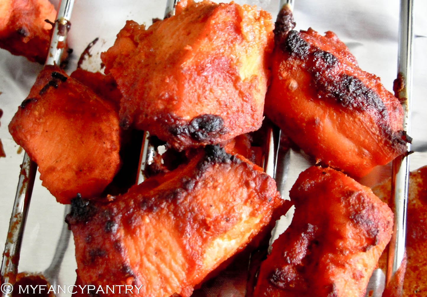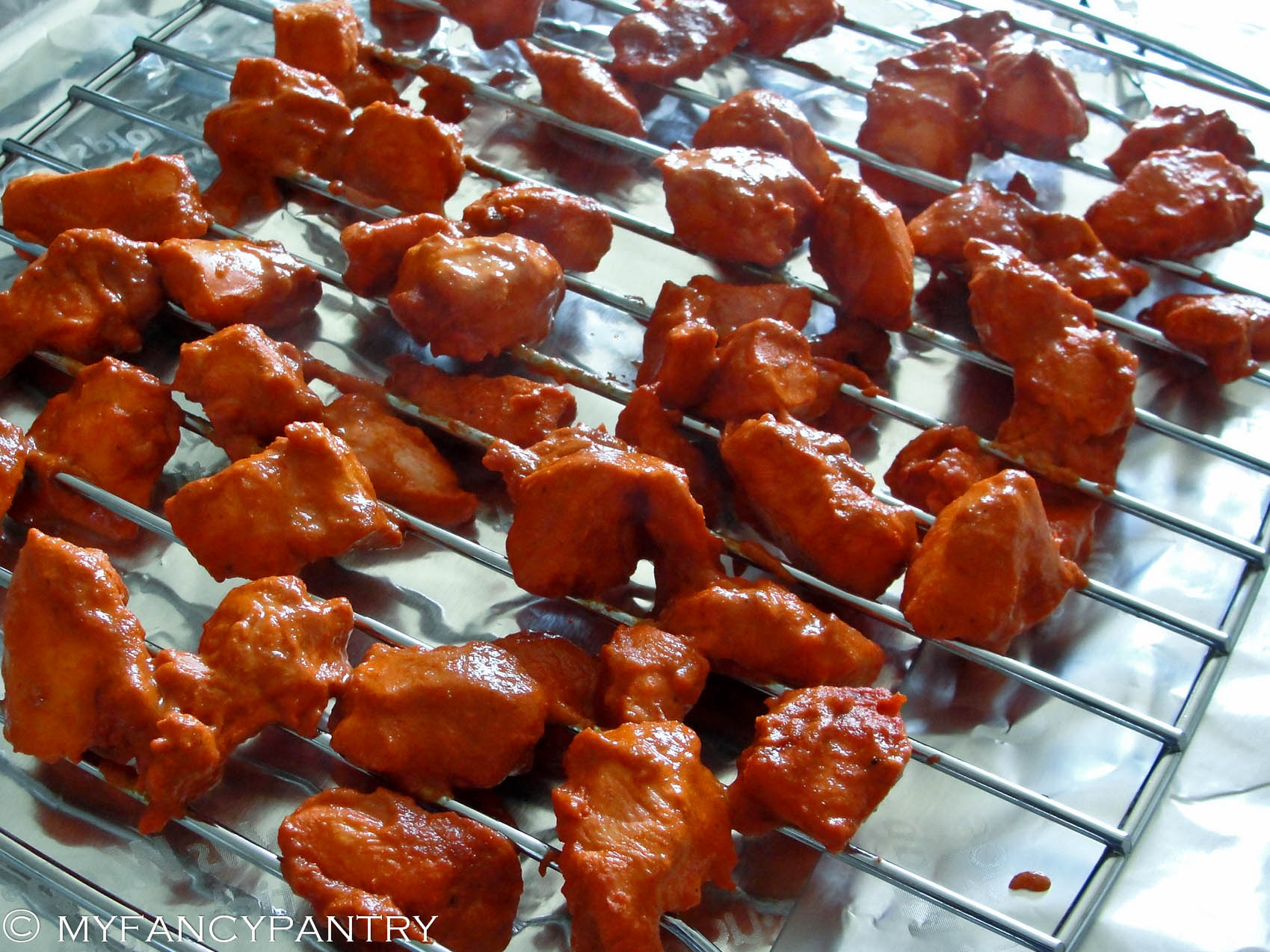 Put them in the oven and broil until they start turning a little black on the edges and look dry.  The chicken won’t actually be dry, the yogurt in the marinade will help keep that from happening.