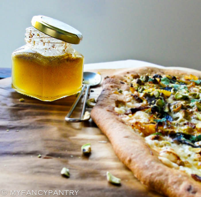 I tossed the pizza back in the oven (still heated to 450 degrees F) and let it cook for 15 more minutes.  Once the crust started to brown, I took the pizza out and drizzled it with a little bit of pistachio honey.  I had gotten the honey from a local shop–in a 3 dollar grab bag.  It tastes good, yes…but I think you could easily substitute regular honey with a little powdered pistachio mixed in.