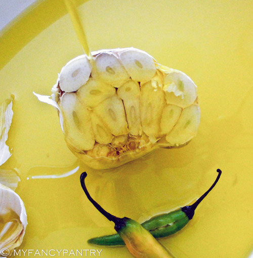 To make the oil, I simply took a small bottle of olive oil–no need to buy anything super expensive–and poured it over a couple heads of garlic that I had sliced in half and some chilies that I had made a few slits into.