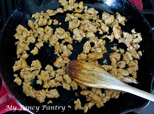 chicken sausage-05132 ← Previous Next → I removed the sausage from the casings so that I could top the pizza with ground meat instead of sliced.