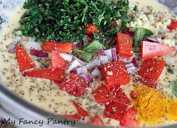 • Add vegetables, spices and shrimp (if using).  Check seasoning and add additional salt–if needed–and pepper.  Whisk everything together so that the batter is well mixed and everything is evenly distributed.