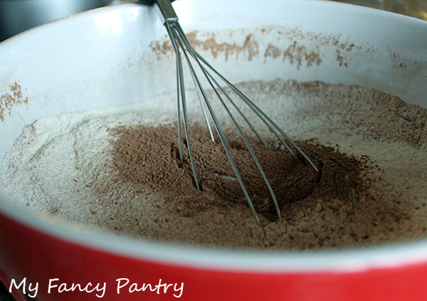 • Sift together the flour, sugar, baking soda, cocoa powder and salt in a mixing bowl.  Whisk to combine.
