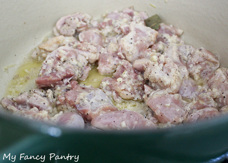 After the chicken had marinaded for about a half hour, I tossed some ghee in my dutch oven and turned the flame to medium high.