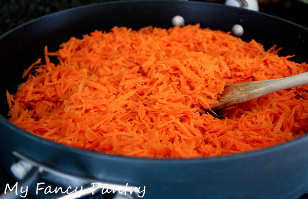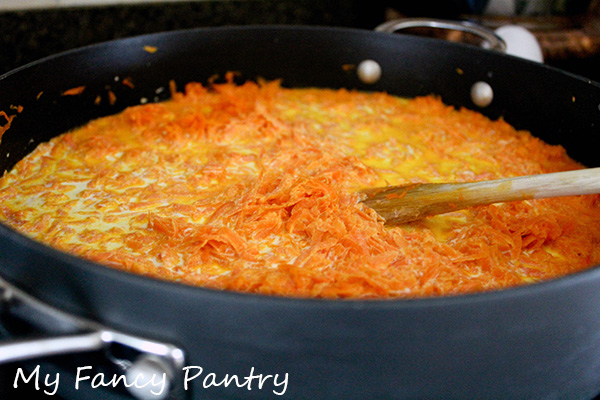 grated carrotsOnce the carrots were grated, I tossed some ghee into a large heavy-duty pan (I used a 12″ Chicken Fryer, which happens to be my favorite pan) and cooked them until they began to soften ever-so-slightly.