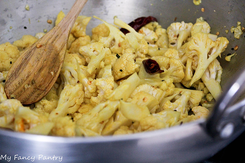 After the panch phoran began to crackle and pop in the oil, I added the chopped cauliflower