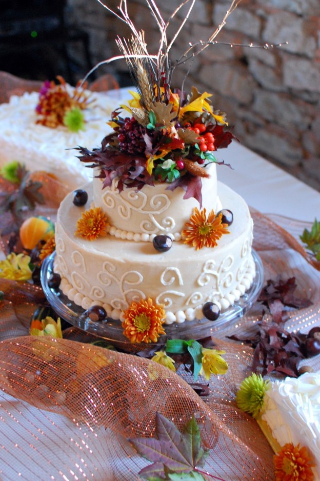 I thought about doing pulled sugar leaves…that didn’t work out (pulled sugar is NOT easy!!! Instead we ended up with giant leaf lollipops). Then I thought about making gumpaste leaves and flowers, but I wasn’t really feelin’ it. So the other day when one of my other co-workers stopped by my house to get some Chinese Lanterns to use in the flower arrangements, I asked her if she had any ideas (see her website here). I told her I wanted to do some sort of a tree topper but wasn’t sure what direction to go in. We brainstormed a little bit and walked around my yard collecting branches and twigs. Since she was doing all the flowers for the wedding she said she’d make a topper to go along with all her arrangements. It turned out incredible! The wedding is tomorrow and its taking place in a really awesome stone barn that is about 100 years old. It’s decorated with a fall theme, using all sorts of things found in nature during this time of year. When I delivered the cake today I just couldn’t get over how beautiful it was!