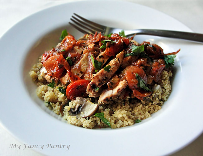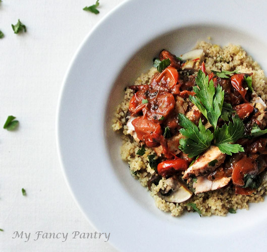 I tossed the grape tomatoes, 2 cloves of garlic (smashed and minced), and a handful of chopped parsley in the same pan that I had previously cooked the chicken. I turned the heat to high and stirred until the tomatoes started to blister and burst–forming a sauce. To keep things from sticking, I added 1/2 c. chicken broth and 1 tsp of flour.