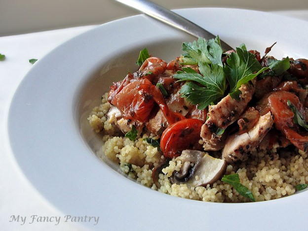 When I was finally ready to begin making dinner, I opened the fridge to check out my produce. I had a container of grape tomatoes (Aldi’s had them on sale for 79 cents…Score!), mushrooms, and lots of fresh parsley.