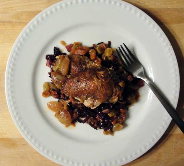 Braised Pheasant with Red Cabbage Wild Rice (via Epicurious)